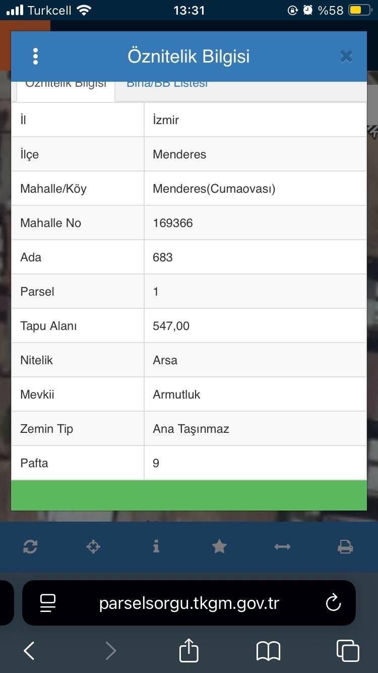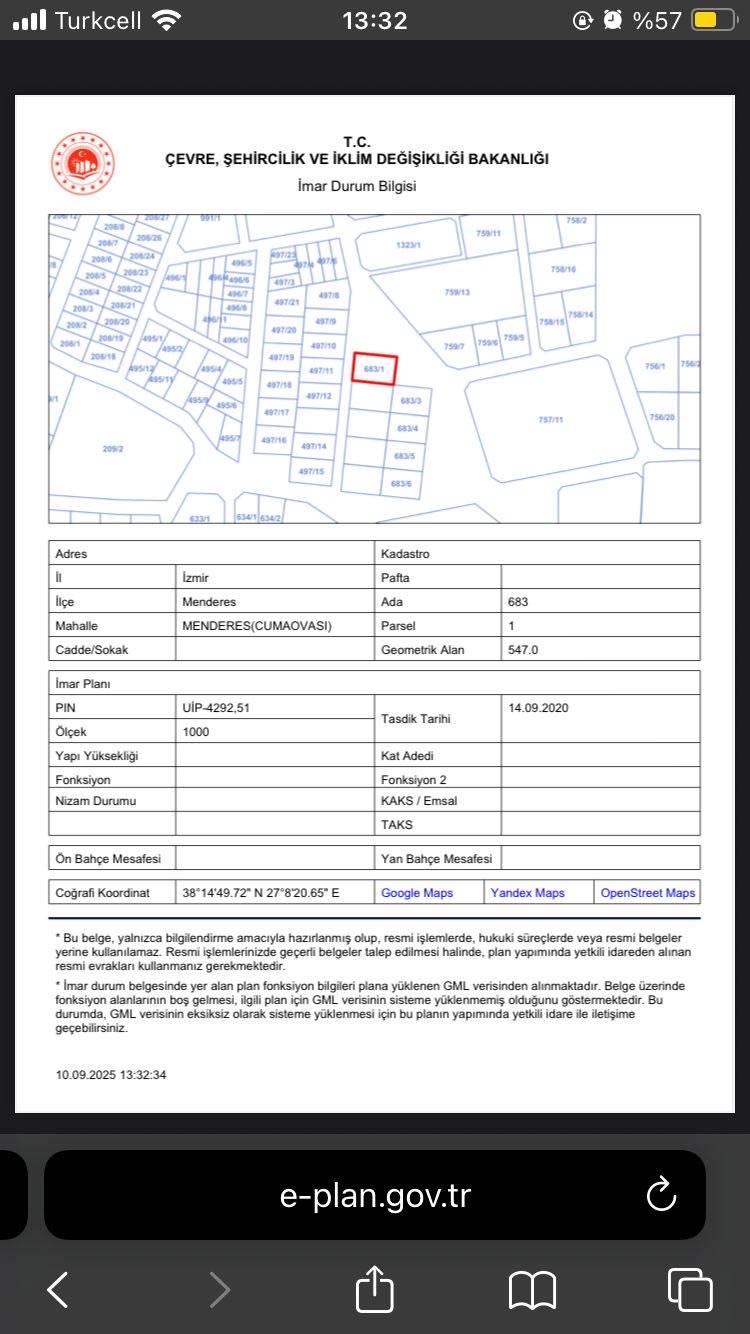 İzmir Menderes Özel Kullanım İmarlı Satılık Arsa – 547 m²